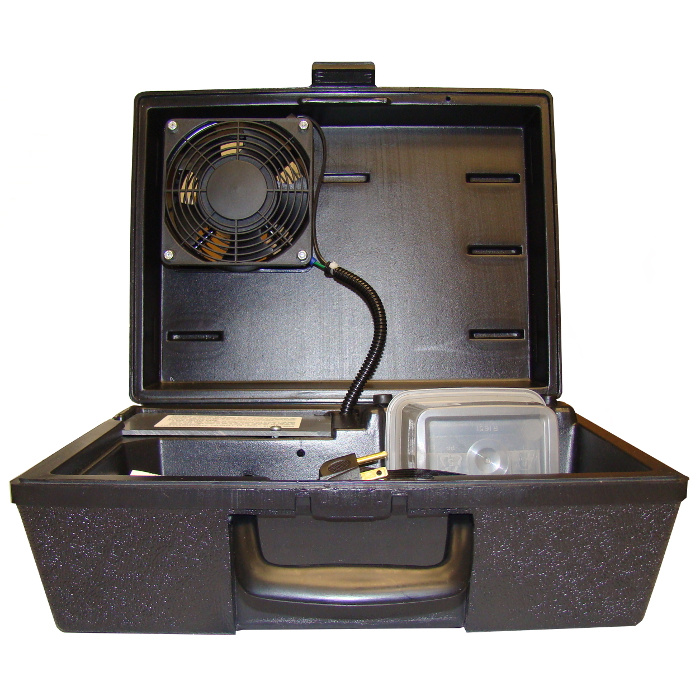 A portable odor elimination cabinet with handle, built in extension cord, and 110 volt high speed electric fan to circulate RX microcell odor counteractant.